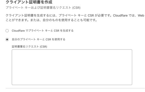 パスフレーズ付きの秘密鍵を作成する。 鍵はECC(Elliptic Curve Cryptography)鍵を使用します。(RSAでもいい) openssl ecparam -name prime256v1 -genkey | \ openssl ec -aes256 -out client.private.key ECC鍵を使用して、Cloudflareにアップロードする…